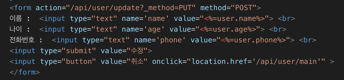 form action = 부분에 ?_method=PUT 이런식으로해야 서버에서 put , delete 가 작동할것이다..