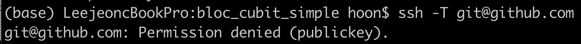 그래서 검색을좀 해보니 git@github.com => jeonghoon@github.com 이런식일경우에 문제가 된다는데 일단 나는 제대로 되어있어서 그 문제는 아닌것같고 좀더 찾아보니 깃헙에 key를 설정해줘야한다는거다 그래서 좀더 검색을해보았는데 키가 깃헙에 연결되어있는지 확인하는 명령어는 아래와 같고 연결이 잘 되어있다면 응답메시지? 같은 헬로 뭐시기같은게 온다 근데 나는 연결이 안되어있었고