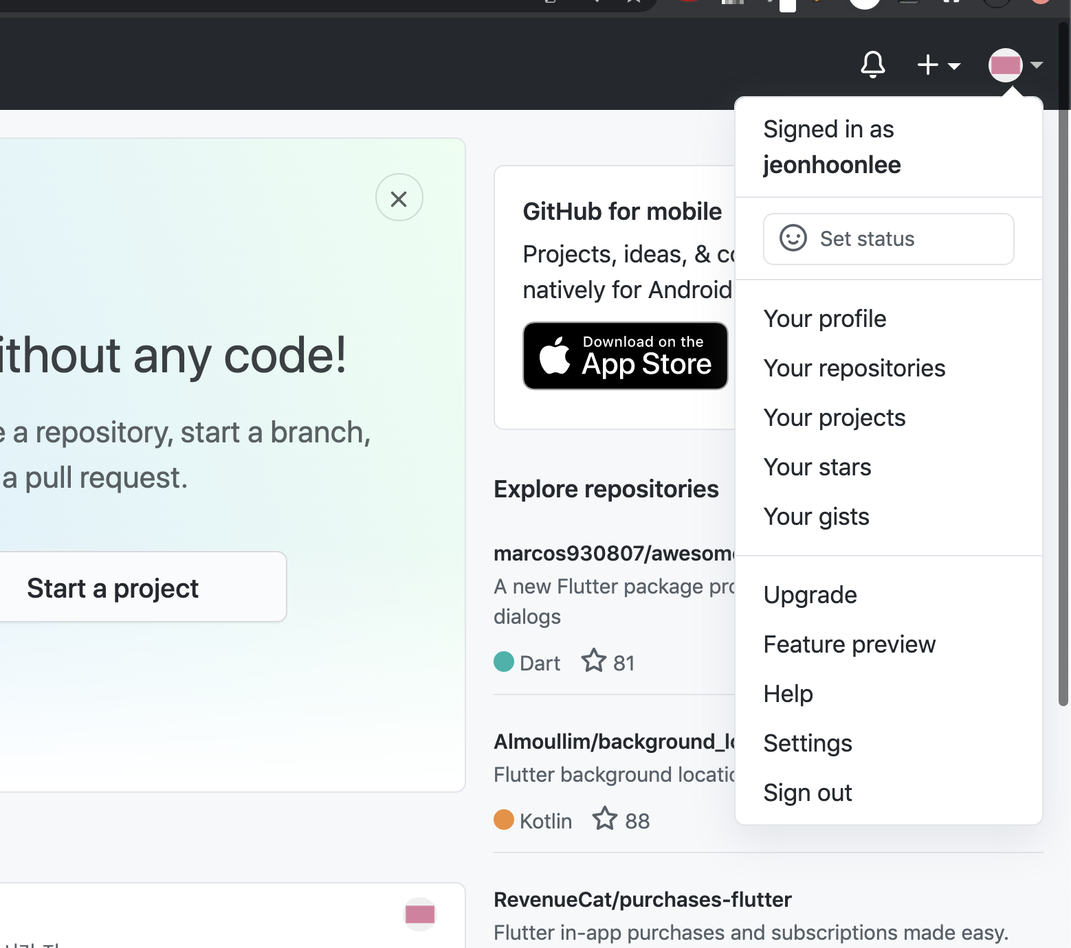 내 깃헙 계정에들어가서 우측 상단에 프로필을 누르고 setting 을 선택한다